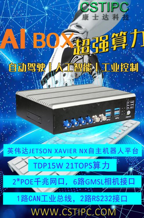 這款基于英偉達JETSON XAVIER NX自主機器人平臺的AI BOX,可謂是巔峰之作,超強算力, TDP15W 21TOPS算力,2個POE千兆網口; 6路GMSL相機接口,1路CAN工業總線; 2路RS232接口,支持9~36V寬電壓輸入,無風扇散熱設計。在自動駕駛,人工智能,工業控制領域提供高性能強穩定的計算機硬件支持。